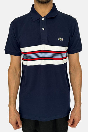 تي شيرت بولو من لاكوست باللون الأزرق الداكن بخطوط متعددة