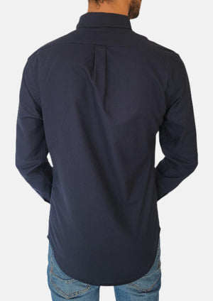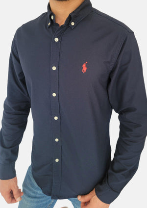 قميص رجالي من رالف لورين بلون أزرق داكن سادة بقصة ضيقة صغيرة